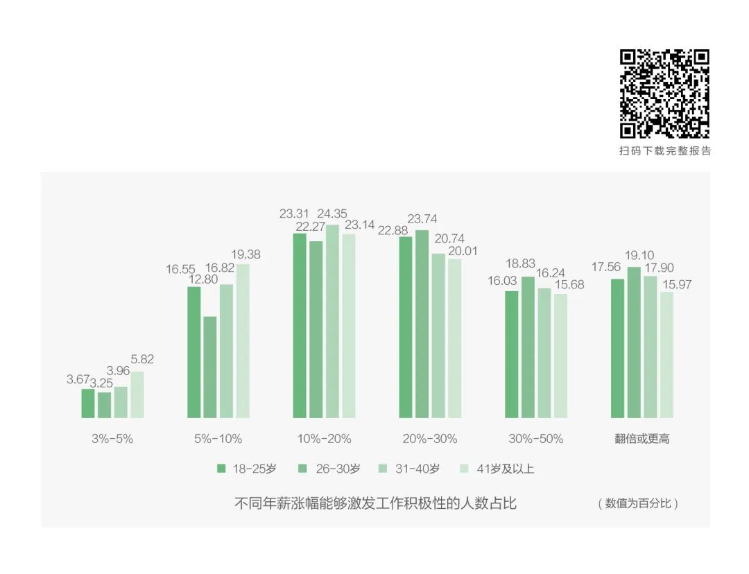 3-5%的普涨达不到效果,Z世代认为最有效的激励应该在年薪涨幅10-20%区间的人数占比最高,这一点和30岁以上和40岁以上人群一致;