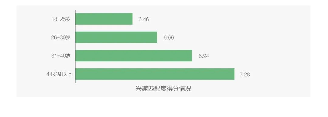 同时我们发现,工作兴趣匹配度与年龄确实呈正相关关系。Z世代职场人工作和兴趣的匹配程度最低,但随着年龄的增加,工作和兴趣的匹配度呈现上升趋势。