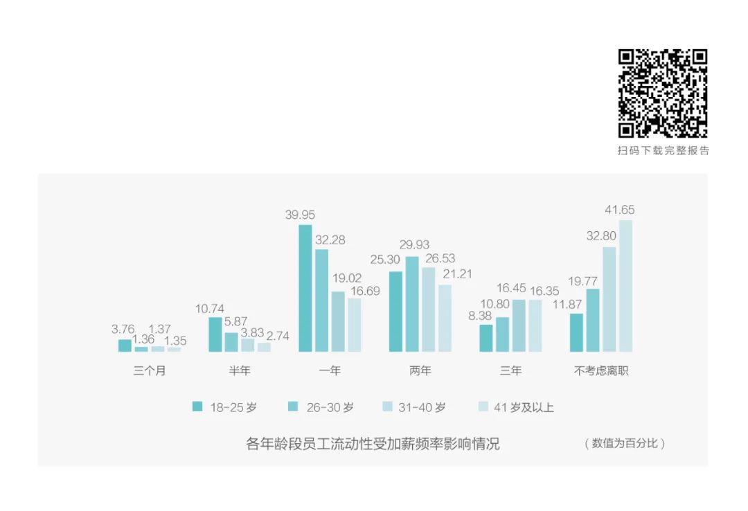 其中3个月不加薪就离职的占3.76%,半年不加薪就离职的占10.74%,而1年不加薪就会离职的占39.95%,均远高于其他年龄段水平。