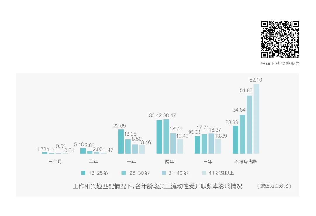 如下图所示,若工作兴趣匹配,则离职意愿出现下降,不考虑离职的比例在各年龄段均升高,其中Z世代不考虑离职的人数占比从17.56%增加到23.99%,增幅为各代际中最大。两年内不升职,各个年龄段的离职意愿也都出现了下降。