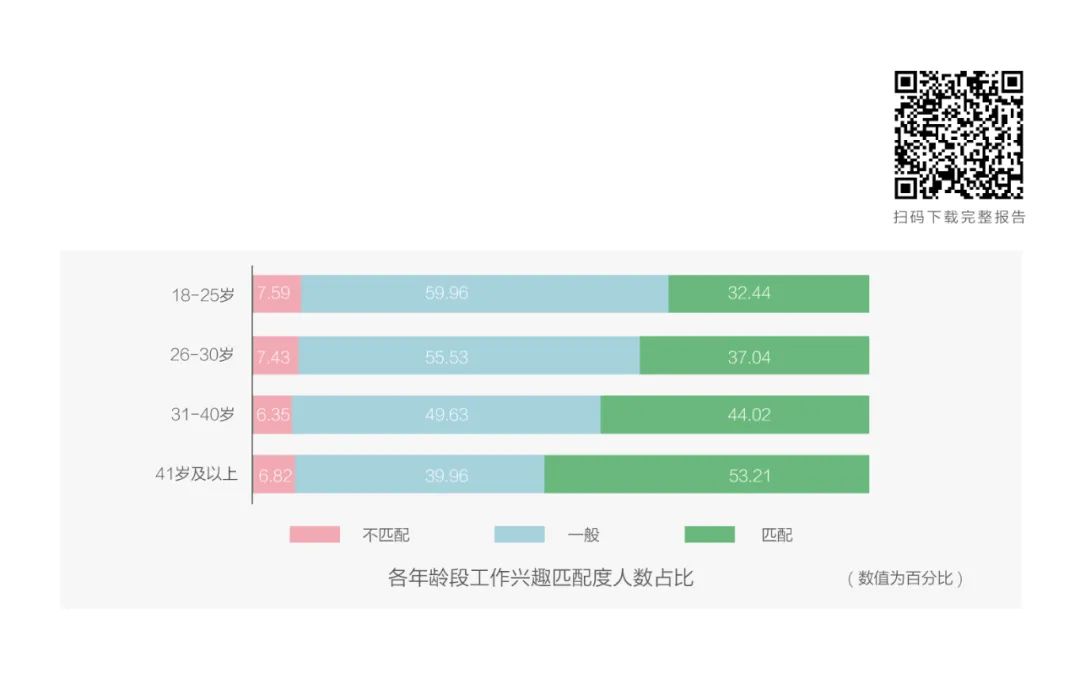从整体样本来看,18-25岁Z世代群体中,只有32.44%的人认为自己工作兴趣匹配,为各年龄段人数占比最低;有7.59%的人认为自己的工作和兴趣不匹配,为各年龄段人数占比最高。