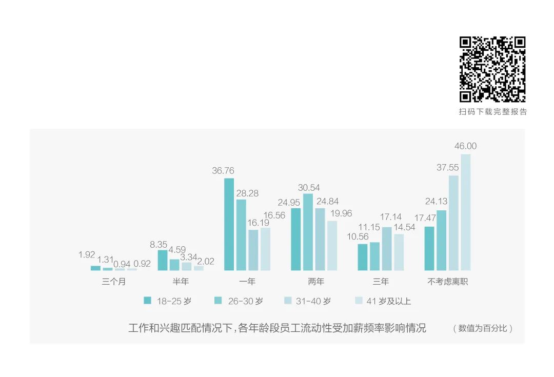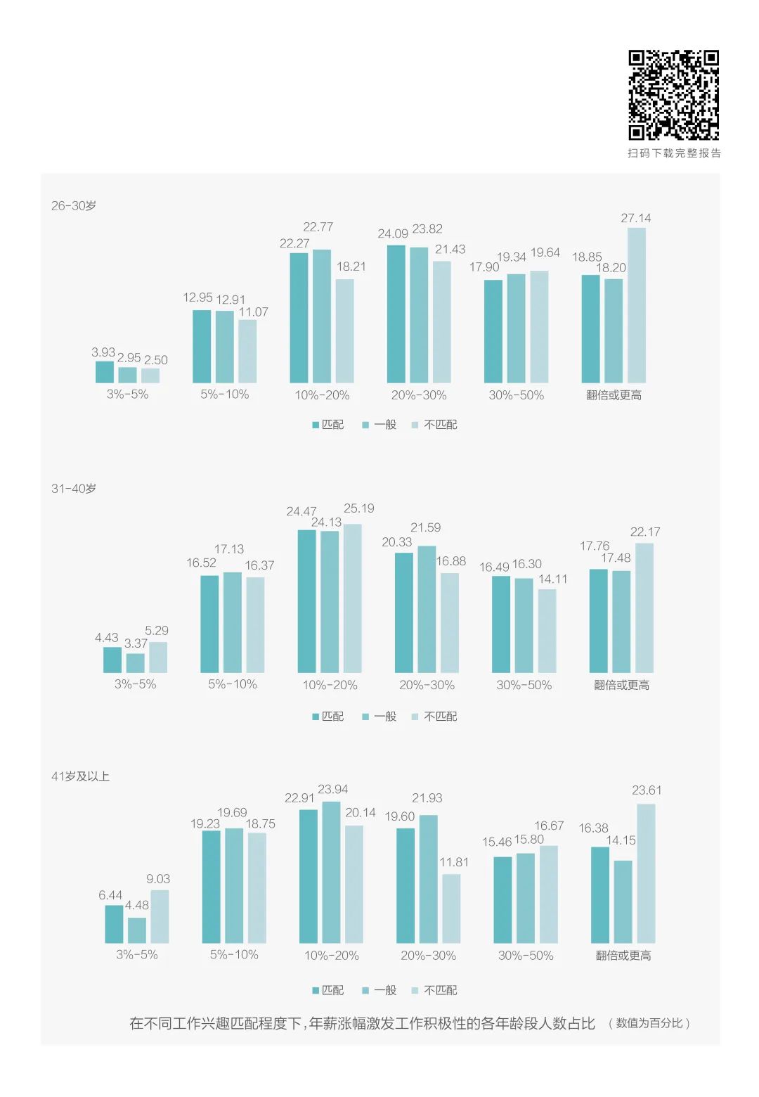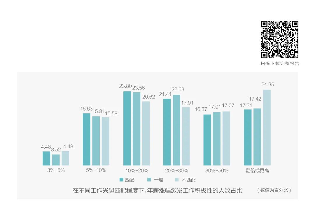若工作兴趣相匹配,相同的年薪涨幅可以激发更多员工的工作积极性(相比工作兴趣匹配度一般或不匹配),但若工作兴趣不匹配,则30%以内的年薪涨幅都不足以激发员工对工作的积极性。有更高比例的员工要求更大幅度的年薪涨幅。