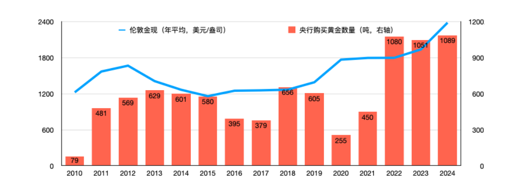 图表3:伦敦黄金现货价格与央行购金数量(2010年至2024年)