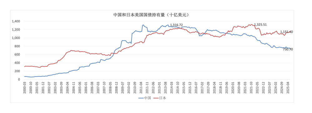 图表5:中国和日本的美国国债持有量(2000年3月至2025年7月)