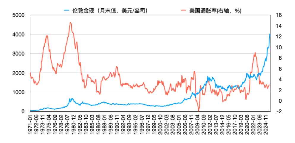 图表6:伦敦黄金现货价格与美国通胀率(1971年1月至2025年9月)