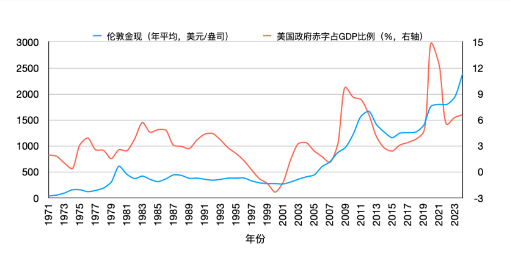 图表4:伦敦黄金现货价格与美国政府赤字占GDP比例(1971年至2024年)