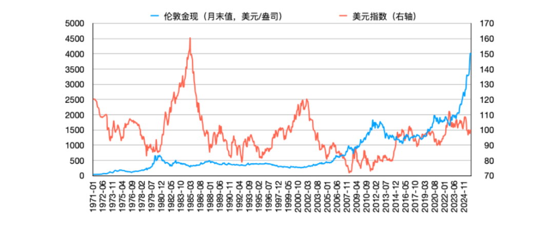 图表1:伦敦现货黄金价格与美元指数(1971年1月至2025年11月)