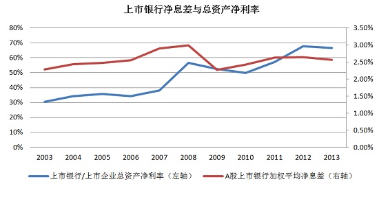 中国的金融体系是由政府垄断的,这种垄断在股权上就体现绝大部分商业银行的最大股东就是政府,在市场上也几乎看不到民营银行或者外资银行的影子。中国银监会年报披露,2013年全国银行业金融机构总资产约151万亿元人民币,其中五家大型商业银行占其中三分之一强,从业人员数和税后利润则更是占了半壁江山。外资银行在上述三项指标中的占比仅为1%到2%。