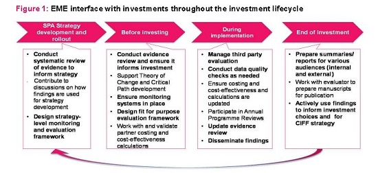 在每一个项目的生命周期里,EME团队的重要作用贯穿始终。他们和一系列第三方评估机构密切合作。在项目开发阶段,他们评估证据以支持投资决策。在投资之前,他们通过强有力的监测系统来为投资保驾护航,并且生成可用于项目决策的数据,包括进行必要的校正。在实施阶段,出于学习和问责制的考虑,对投资的影响进行评估。投资结束之后,CIFF还非常强调新知识的发现和传播。