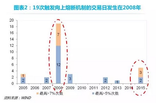 如果分年份考察,大多数可能触发熔断机制的交易日都发生在2007年和2014年两轮大牛市中,例如在2008年,共有19个交易日涨幅超过5%,其中7个交易日涨幅超过7%。