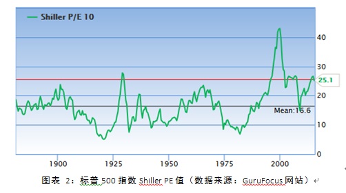 需要指出的是,当前美股股价正处于历史高位,不能简单以美股指标为基准对A股进行评判。根据GuruFocus的统计,如图2所示,2015年10月9日标普500指数的Shiller PE值为25.6,比历史平均水平16.6高出54.2%,仅次于大萧条前和互联网泡沫时期,处于第三历史高位。