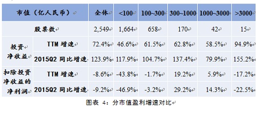 从总体来看,A股二季度盈利增速为16.2%,远高于TTM盈利增速。但进一步计算发现,A股二季度盈利的高速增长并非归功于公司主营业务利润水平的提升,而主要是由于投资净收益的提升。投资净收益是指企业投资收益减投资损失后的净额,由“股票投资收益”、“债券投资收益”和“其他投资收益”三部分构成。我们将上市公司净利润拆分为投资净收益与扣除投资净收益的其他净利润(营业利润等)两部分,如图3所示,左图为TTM盈利,右图为第二季度盈利。 第二季度净利润从2014Q2的7.08百亿元上升至2015Q2的8.23百亿元,增长率为16.2%,而投资净收益同比增长从1.35百亿至3.03百亿,增长率高达123.9%,除去投资净收益的净利润增速为-9.2%;TTM盈利同比增长6.8%,而投资净收益同比增长则高达72.4%,除去投资净收益的净利润为-8.6%。投资收益高速增长主要得益于2014年下半年和2015年上半年股市的高收益率,但这种收益并不具有可持续性,今年第三季度股市的大跌会显著降低上市公司的投资净收益,很有可能会导致盈利增速的迅速回落。