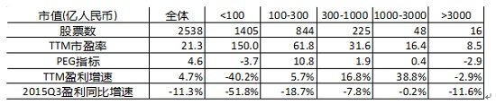 图表1:分市值指标对比(截至2015年11月13日)
