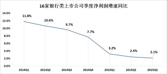 对2014年以来的银行类上市公司季度报告披露的盈利数据进行同比,结果更为直观,如图表4。仅仅两年,银行季度盈利增速水平同比从两位数快速下跌至个位数。