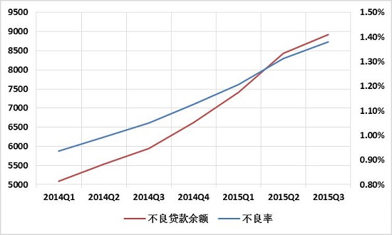 与“低市盈率,盈利增速下降”的现象相对应的是银行业的不良率和不良贷款余额均创出新高。根据上市公司2015Q3报告所发布的数据统计,16家上市公司的平均不良率已达1.38%;不良贷款余额达8920余亿元,如图表5。