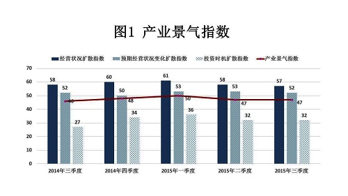 产业景气指数在三季度为47,呈轻度收缩。我们构造的产业景气指数包含当前经营状况、预期经营状况变化以及投资时机这三个子指标,为其扩散指数的平均。和现有的经济指数相比,该指数能够反映经济绝对景气程度,并且具有前瞻性。