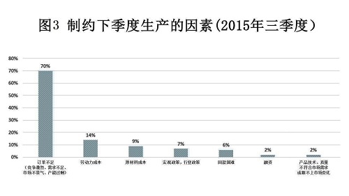 产业经济面临的最大挑战仍然是需求不足。70%的企业认为订单不足是制约下季度生产的重要因素,较上季度的55%更为严重(图3)。其次是成本,14%的企业回答“劳动力成本”,9%的企业回答“原材料成本”。其它较重要因素为宏观政策(7%)、回款困难(6%)。而融资不是瓶颈,仅有2%的企业将之列为制约生产的因素。这些结果在过去几个季度的调查中高度一致。