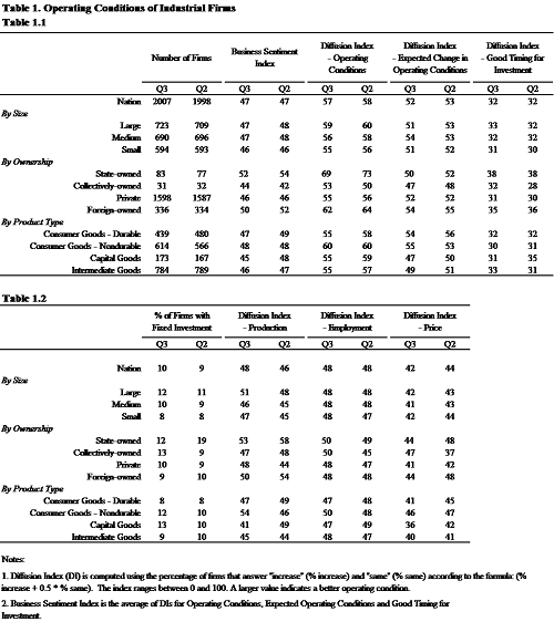 如表一所示,企业生产量和用工情况的扩散指数三季度为48,稳中有降。产品价格水平在三季度明显下降,扩散指数为42,较二季度(44)的降幅更大。因此,经济已进入通缩状态。其中资本品价格下降最为严重,扩散指数仅为36,显然是疲软的投资所致。