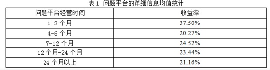 最后,收益率分析。为了更详细地描述问题平台特征,我们以信息较为完全的258家问题平台为样本,针对问题平台的收益率均值进行计算,得到结果如下表1所示。