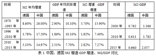 (表1 中国、德国M2增速-GDP增速、M2/GDP对比)