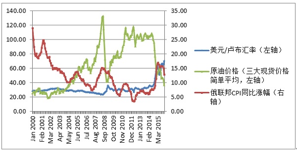 在浮动汇率制度下,油价大跌导致俄罗斯卢布的大幅贬值,这一方面有利于俄罗斯国内财政收入的稳定和石油以及贸易品部门的生产和就业(见《卢布汇率制度改革对中国的启示》一文)。但另一方面,卢布贬值也通过汇率的价格传递效应,直接抬高以卢布计价的进口商品价格,进而对国内整体物价水平产生冲击。国际经济学里面大量的经验研究表明,对于发达国家如美国而言,这种汇率的价格传递效应一般较小,一方面是由于进、出口占美国经济的比重较低,另一方面,大部分进、出口商品价格以美元计价,从而明显降低了汇率波动通过价格传递效应对国内经济的不利影响。但对于像俄罗斯这样高度依赖大宗商品进、出口的小国经济体而言,汇率的传递效应较大,根据Yuri Ponomarev(2014)的一项估计,2002年到2012年,俄罗斯汇率变动对俄12月之后国内物价水平的影响达到47%。假如居民家庭部门的名义收入不变,物价上升也就意味着家庭部门的实际收入水平的下降,也就是说,油价下跌的不利冲击大部分最终由全体人民来分担了。