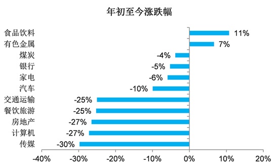 A股风险偏好下降,对业绩更加看重。投资者已经开始注意到经济的疲弱,开始追捧食品饮料等业绩稳定增长的板块,该板块年初至今上涨11%,成为表现最好的行业。受制于监管对于并购重组等政策的收紧,同时“讲故事”的成分多而业绩兑现较难,传媒板块年初至今下跌50%,成为表现最差板块。
