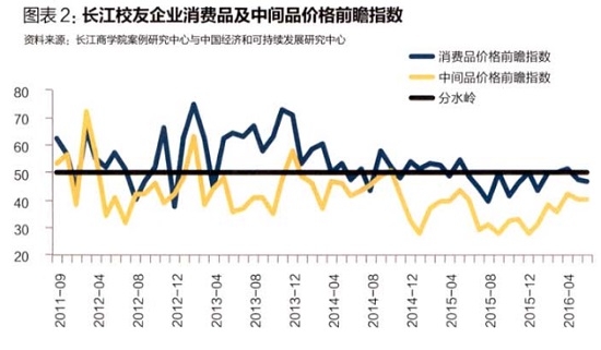 从图表1中可以看到,在我们将近5年的调查中,无论是用工成本,还是总成本,始终在高速增长。从图表 2中可以看到,价格方面的指数相对比较低迷,尤其是中间品价格前瞻指数,长期处于远低于50的水平上:企业在成本持续高速增加中,没有或难以用提价的方式将成本端的压力转嫁给下游企业或消费者。为什么会出现这样的局面呢?
