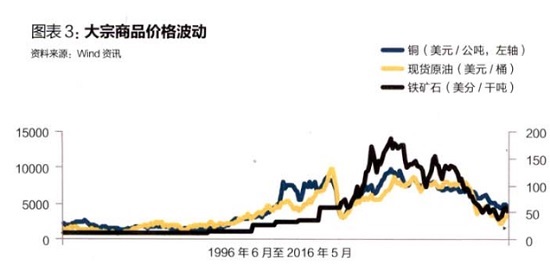 首先,大宗商品价格。近年来,包括石油在内的大宗商品出现了价格大幅度的下滑(图表3),这对中国企业的运营无疑是一个巨大的利好。企业对能源和原材料的需求经常存在短期刚性的特点。举例来说,石油价格上升导致航空燃油价格上升,航空公司的运营成本无疑会升高,但在短期内,航空公司很难通过快速减少航班来降低成本。现在大宗商品价格大幅下滑,笔者认为中国企业应该抓住这个机会尽快消除产能过剩。假如未来大宗商品价格重新上涨,那么届时调整的难度也必将上升。