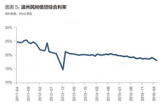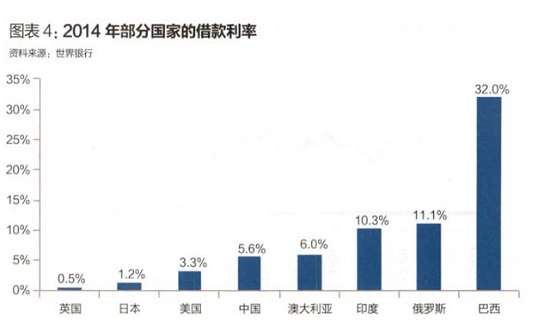 从图表4中可以看到,中国的(官方)借款利率低于巴西、俄罗斯等国,但低于美英日等发达国家,但如果我们看民营企业的边际借贷利率,也就是我国的民间借贷利率(图表5),我们和巴西的差距就大大缩小了。