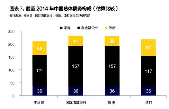 首先,无论是政府,还是居民,其债务率都不高。图表7是国外一些机构对2014年中国债务结构的估算,其数值都是债务总额占GDP的百分比: