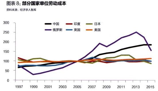过去我们经常说中国是“世界工厂”,而成就这种景象的原因在相当程度上是靠着中国企业的低成本劳动力,但经过了多年的发展,中国虽然实现了人均GDP的快速发展,但中国的劳动力成本上升的更快。这方面单位劳动成本(Unit Labour Cost,简称ULC)是一个不错的指标,因为这个指标衡量的是每单位产出所需要的人力投入。下面是经济学人智库(Economist Intelligence Unit ,简称EIU)关于部分国家的ULC数据。很明显,在1997年时,中国的ULC最低,但到了2015年,中国在这些国家中已变为了第一(图表8)。