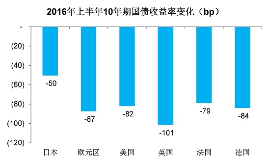 债券市场收益率延续下行趋势,负利率频现。经济前景并不明朗,同时受到英国退欧等黑天鹅事件干扰,全球主要经济体的国债收益率上半年延续了此前的下行趋势。日本、欧元区和德国的长端国债利率都已经出现负利率。