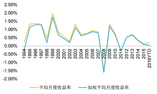 海外对冲基金业绩分化明显,小型对冲基金跑赢。从整体表现上看,全球对冲基金行业2016年上半年平均月度收益率从2015年的0.07%提升0.15%到0.22%,但加权平均月度收益率从2015年的0.12%降低0.08%到0.03%,两个指标走势明显背离,表明上半年全球对冲基金行业业绩分化明显,而规模较大型的对冲基金跑输小型对冲基金。