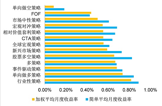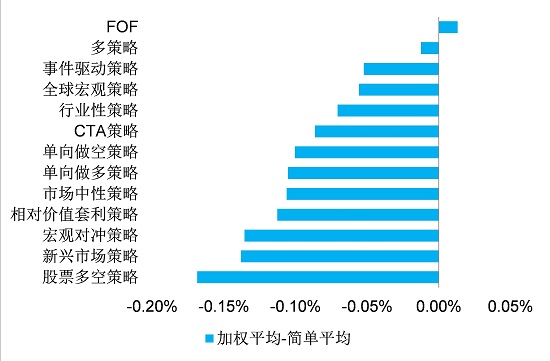 小型基金表现普遍优于大型基金。此外,还可以通过对比加权平均月度收益和简单平均月度收益来考察执行每种策略的对冲基金大类内部不同基金表现的分化程度,考察二者之差,如果差越大则表明在这一类别的对冲基金中规模较大的基金表现优于规模较小的基金,反之亦然。通过这一指标可以明显看到,FOF是唯一一个大基金的表现优于小基金,表明FOF具备明显的规模效应,其它所有类型基金都是小型基金表现优于大型基金,其中股票多空策略表现地更为明显,而这种策略的一个特点是相对灵活,因此小型基金更容易操作、交易成本也更低。
