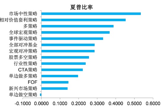 单边做空策略的风险收益比最不合适。如果综合考虑投资者投资不同类型对冲基金的风险,即这些对冲基金业绩表现的波动性,我们可以使用夏普比率(Sharpe Ratio)来对基金的表现进行风险调整,总体看来,只有单边做空策略的夏普比率为负,风险和收益实质上不对等。