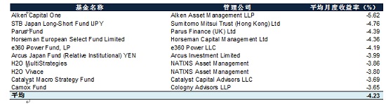 图表5:全球对冲基金上半年平均月度收益率+0.15%,但加权平均月度收益率-0.08%