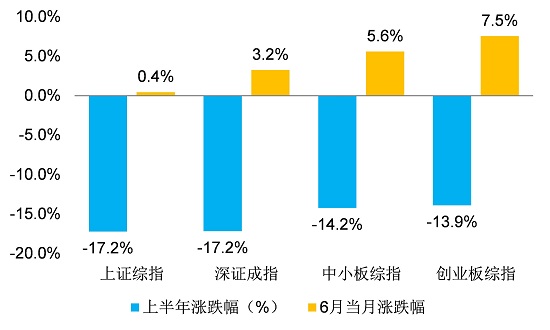图表12:A股主要指数6月微涨,但仍未收复上半年跌幅