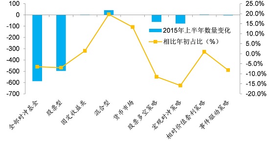 国内对冲基金行业收缩明显,特别是股票型。从总数上看,截至6月30日,国内对冲基金总数减少588家,10年行业高增长后第一次出现负增长,而减少的主要是股票型对冲基金(减少497家),混合型冲基金相较年初有所增长,增加42家。