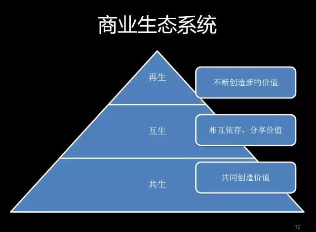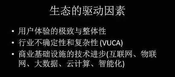 今天出现了像苹果、包括国内BAT的这些生态,会有三个层面不同的生态理解。一个从宏观层面,区域经济发展的层面,第二个从行业层面,第三个从企业层面。我想一个一个层面理解,到底什么是生态。