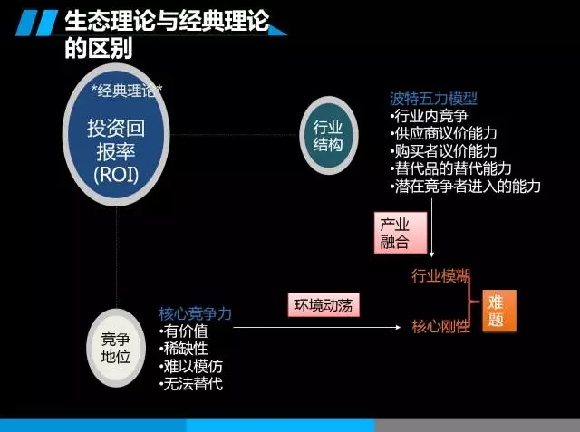 下一个分享竞争优势和生态优势的关系。刚才讲了一个很重要的概念,企业内部的竞争优势帮助企业实现超额利润。不是说竞争优势不重要,我认为竞争优势仍然很重要。我觉得在今天这个技术环境里面,大家谈生态的同时,往往忽略了生态优势的另外一个纬度。我并不是拿生态优势否定竞争优势,这两个是相辅相成的,你可以从竞争优势走向生态优势,也可以从生态优势走向竞争优势。