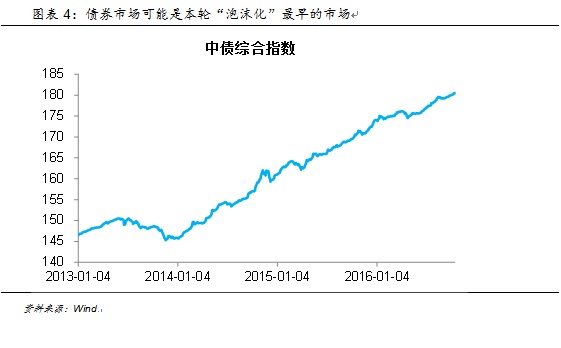 房地产市场价格上涨不是这轮货币宽松周期中资产价格泡沫化的孤例,金融市场中的泡沫化现象更为明显,2014年以来,中国的股票市场、债券市场、大宗商品市场等,都经历了资产价格的泡沫化过程,我们可以按照先后顺序,对这些资产泡沫化的过程进行梳理。