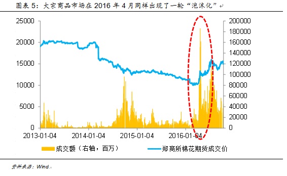 到2016年4月,股票市场和债券市场都已经水位不低,资金又开始涌向另一类金融资产——大宗商品市场,虽然这一市场投资门槛较高,但同样出现过一轮“泡沫化”。2016年4月,中国的大宗商品交易市场成交量忽然异常放大,价格快速上涨,例如4月21日当日,螺纹钢主力合约成交量就达到5,500多亿元,按照合约报价计算,当天的交易量可以买下全球一年所产的螺纹钢。其他流动性较好的商品品种均出现了这种现象,螺纹钢、铁矿石、棉花等合约均出现了交易价格的快速上涨,伴随成交量的快速放大,海外投资者惊呼“中国大妈”已经成为了大宗商品市场的主流交易员。而这一轮泡沫也在交易所不断提高保证金要求和交易费用之后破灭,交易量回归到正常水平。