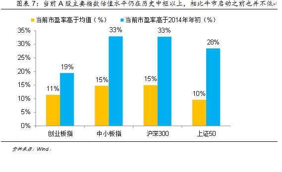 股票市场应当是资产价格“泡沫化”幅度最大的市场,也是“挤泡沫”最为惨烈的市场。事实上,对于流动性泛滥时期的资产价格,“水往低处流”是一个永恒不变的真理。2014年伴随着债券市场的走牛,股票市场的相对估值优势显现,叠加同期房价开始走平,A股事实上从年初已经开始了估值修复的过程,此后更是在11月底降息之后开启了蓝筹股带领大盘指数快速上涨的“疯牛”行情,而同期的经济基本面并没有发生明显变化。