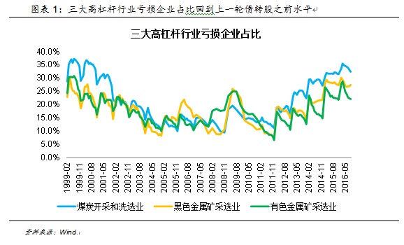 从中国银行业监管部门公布的数据看,截止到2016年上半年,全行业不良贷款比例仅仅为1.75%,如果对照中国在上一轮经济下行不良率激增时的数据看,当时的商业银行整体不良率接近20%,似乎今天的情况并不危险。但从企业部门的实际情况看,显然这一不良率的官方统计数字并不合情合理,我们选择了煤炭、钢铁和有色金属三大高杠杆、强周期行业作为代理变量考察这一问题,截至2016年9月,这三大行业的亏损企业占比分别达到32.4%、27.5%和22.1%,仅分别低于历史最高水平4.9%、3.1%和8.7%,亏损情况基本达到上一轮不良资产爆发时期水平。
