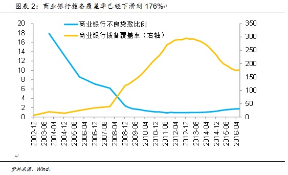 中国的银行业已经通过各种各样的方式在其资产负债表中腾挪和隐藏不良资产,例如一些本应该被确认为不良的贷款被确认为关注类贷款,一些银行通过向企业提供新贷款以偿还原有贷款或甚至只是偿还利息,其它例如通过影子银行的方式将不良资产抽离其资产负债表等。一个具有说服力的数字是银行业的拨备覆盖率,这一数字在2016年三季度末已经下滑到176%,而监管红线是150%。