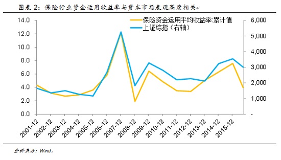 保险资金投资上市公司股权的第一阶段是单纯的财务投资,在这一阶段被投资标的的股权通常以“交易性金融资产”或“可供出售金融资产”记账,因此二级市场的股价波动会对保险公司的投资收益率产生严重影响。总体上看,虽然保险公司的主要资金配置在以债券为主的固定收益类产品上,但由于固收产品收益波动较小,因此影响整体收益率水平的还是二级市场股票投资的表现,从历史数据看,保险行业整体的资金运用收益率和资本市场表现高度相关。