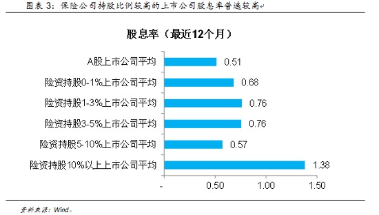 但从资金性质上看,保险公司仍然属于偏好固定收益的投资者,即使是财务投资,也希望能够规避股价的波动,获得持续稳定的回报,高股息率上市公司的“类债券”特性具有较强的吸引力,因此股息率成为保险资金看重的因素之一。从A股实际情况看,最近12个月上市公司平均股息率为0.51%,而险资持股较多的上市公司平均股息率明显高于这一水平,特别是险资持股比例在10%以上的上市公司,股息率平均为1.38%。
