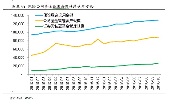 在资产端,收益率的快速下降和可投资资产的快速膨胀成为一对不可调和的矛盾。虽然本轮货币政策的宽松周期真正开始是在2014年的年底,但从2013年开始随着经济增速的放缓,实体经济所能提供的收益率已经开始下降,以10年期国债的收益率为例,这一过程一直持续到最近。而从保险公司的实际情况看,由于中国的保险渗透率仍然不高,同时相比其他替代的投资品种,保险产品的整体吸引力不断上升,特别是在整体外部收益率下降的大背景下,保险产品的投资+保障属性使得保费增速持续走高,随着保险产品的销售和现金流的流入,保险公司的资金运用余额在持续稳定增长,已经成为最为重要的机构投资者之一,且这一重要性还在不断提高,保险公司急于寻找能够提供持续、稳定,并且可以覆盖自身资金成本的可投资资产,将目光投向高风险高回报的股票市场实属必然。