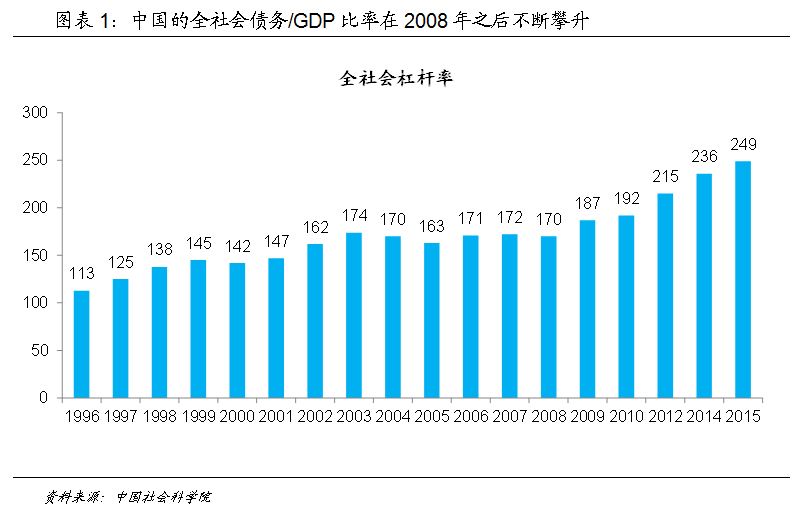 诚然,中国的杠杆率一直是各界关注的主要问题,从中国社科院的测算来看,全社会债务与GDP的比率确实不断上升,特别是在2008年全球金融危机之后,从当年的170%上升到2015年的249%,这与当时中国政府在2008年全球金融危机之后采取的“四万亿”经济刺激计划有关。