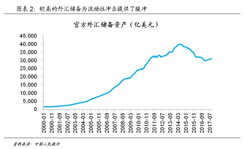 但与其他经济体不同,中国的高杠杆更多来自于接近50%的高储蓄率,和其他主要的东亚经济体类似,这种高储蓄率保证了中国的外债水平并不高。而同时,这种高储蓄率保证了中国居民部门的杠杆率一直较低,政府债务杠杆率也低于美国、日本和欧洲主要经济体,为全社会的潜在债务风险提供了缓冲。更重要的是,中国的外汇储备可观,截至2017年9月底,中国外汇储备达到3.1万亿美元,这为资本流动提供了足够的缓冲垫。